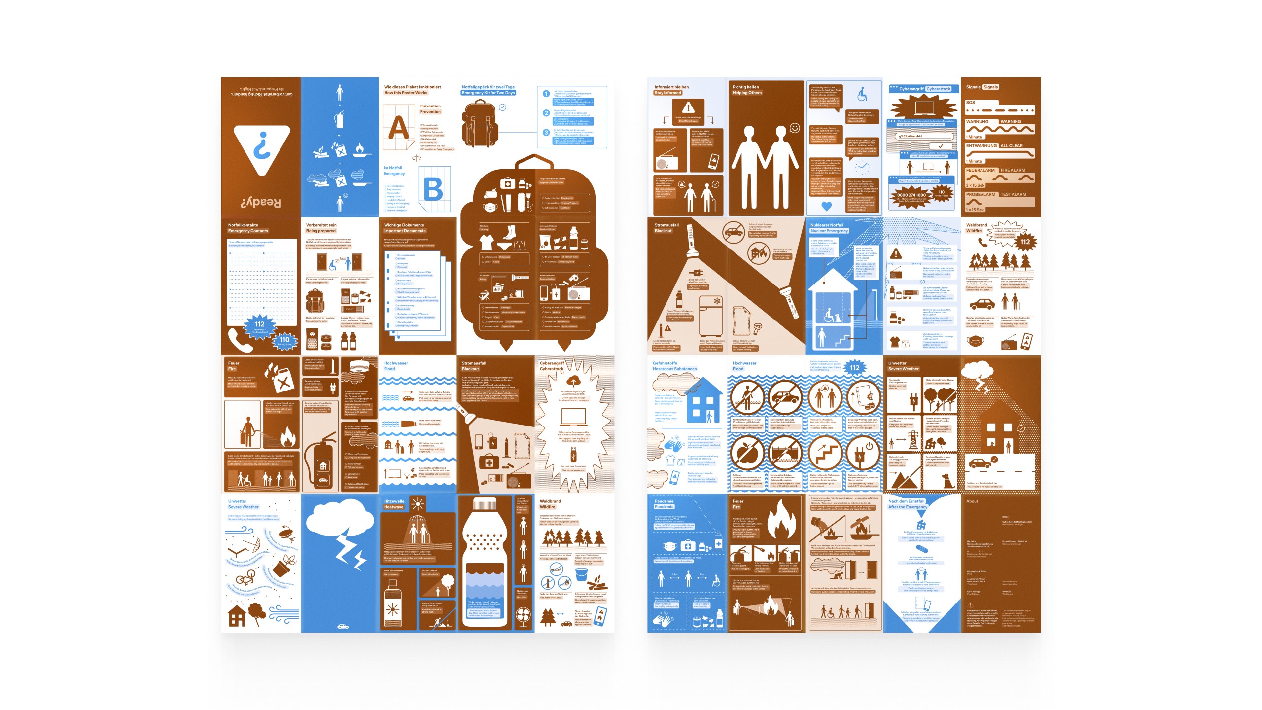 Our bachelor’s thesis examined symbol-based communication in the field of civil protection and disaster preparedness. This project includes a digital tool designed to overcome language barriers during rescue operations, as well as a fold-out poster that addresses personal preparedness and self-efficacy in civil protection—supplemented by infographics on fire extinguishers and emergency supplies.